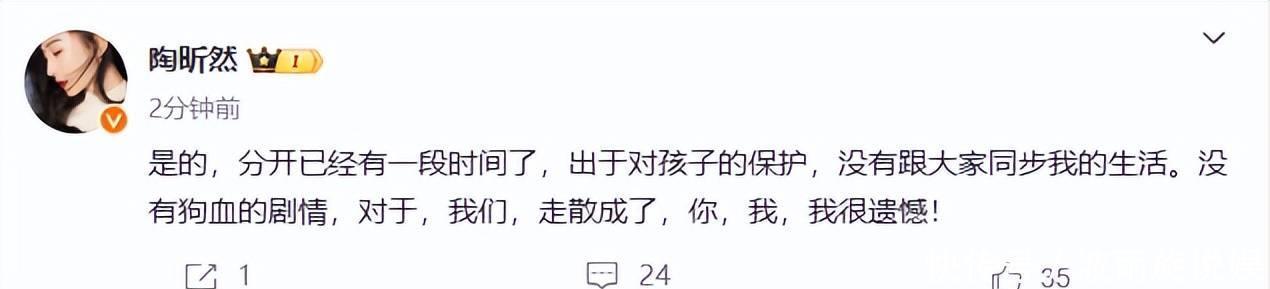 3月25日,《甄嬛传》安陵容的扮演者陶昕然发文承认离婚,已经和何建泽分开一段时间,出于对孩子的保护,没有跟大家同步,没有狗血的剧情“我们,走散成了,你,我,我很遗憾!”