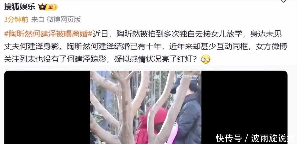 据悉,3月25日有媒体拍到陶昕然一个人接送女儿放学,老公何建泽不知去向,女方微博关注已经没有何建泽的踪影,被质疑低调离婚了,没想到陶昕然迅速证实离婚。